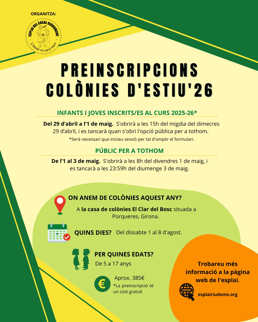 PREINSCRIPCIONS CE’26 COLÒNIES D’ESTIU 2026 Les colònies tindran lloc del dissabte 01 d’agost al 08 d’agost i seran a Casa de colònies El Clar del Bosc, Banyoles. Enguany mantindrem el format d’inscripcions de l’any anterior: Preinscripcions il·limitades i inscripcions limitades. […]